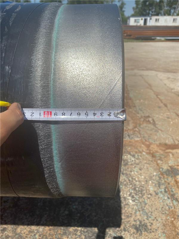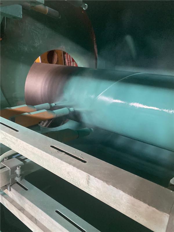 開始生產(chǎn)時(shí),先用試驗(yàn)管在生產(chǎn)線上分別依次調(diào)節(jié)預(yù)熱溫度及膠粘劑防腐層的厚度,聚乙烯層的包覆采用側(cè)向纏繞工藝,應(yīng)確保搭接部分的聚乙烯完全輥壓密實(shí),并防止壓傷聚乙烯層表面,膠粘劑的涂敷采用側(cè)向纏繞工藝,且涂敷必須在環(huán)氧粉末膠化過程中進(jìn)行,以確保膠粘劑與環(huán)氧涂料能相互滲透,使其達(dá)到各項(xiàng)要求后方可開始生產(chǎn)。